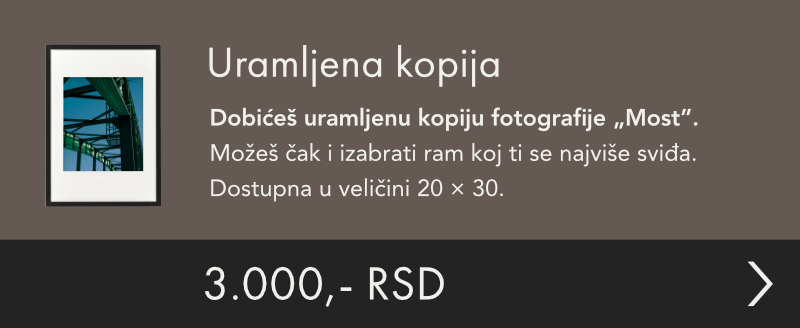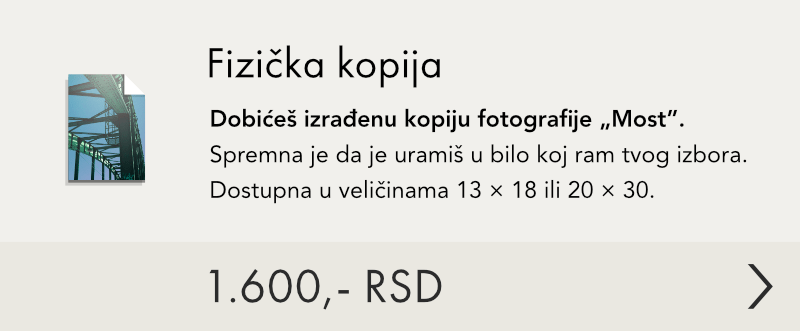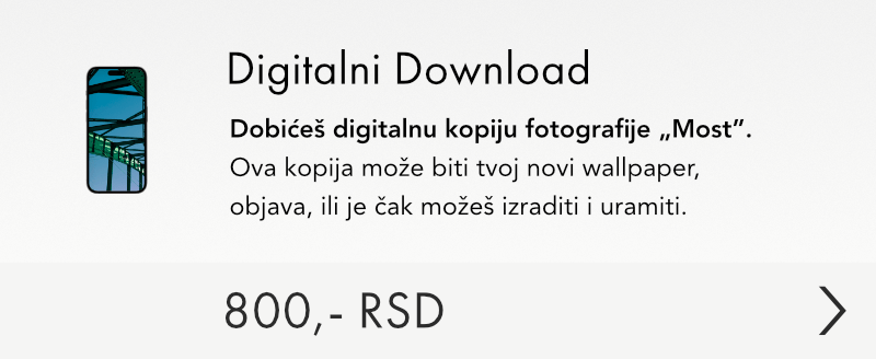 Uz kupovinu dobijaš fizički ili digitalni sertifikat autentičnosti, kao i popust od 30% na bilo koje sledeće fotografisanje.
